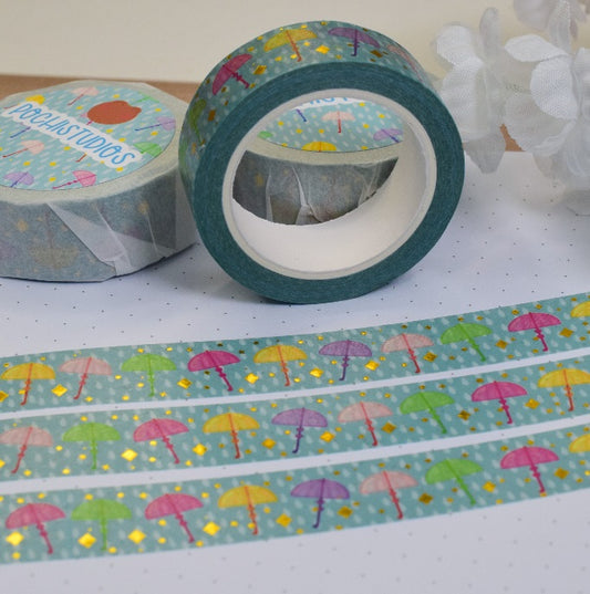 Rainy Multicolor Umbrellas Gold Foil Washi Tape